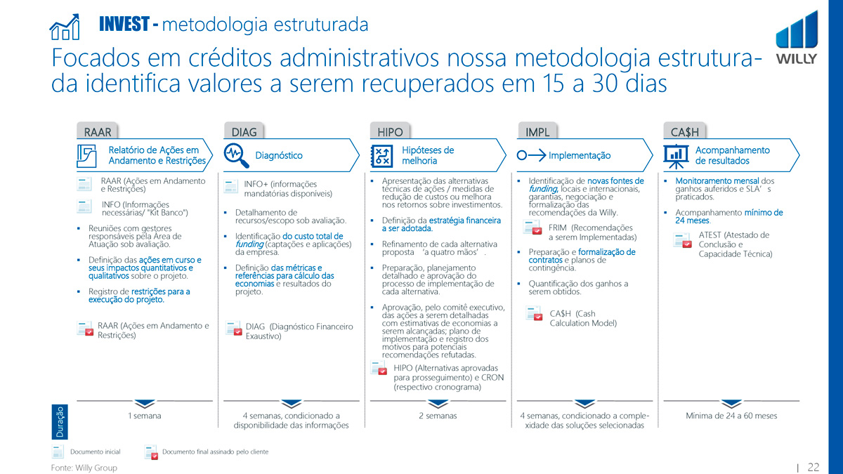 Nossas estruturações financeiras e de capital permitem que as taxas praticadas sejam mais atraentes, tanto para nossos clientes como para investidores. A Willy não perde por taxa, pois caso contrário, não apresenta proposta de trabalho.