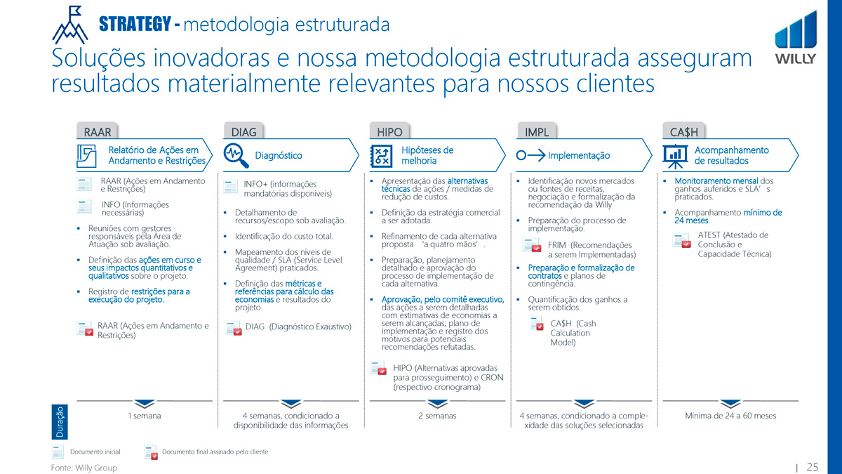 O STRATEGY é uma metodologia que identifica os recursos, produtos e serviços que podem ser ofertados pelos clientes da Willy ao network corporativo desenvolvido conjuntamente.