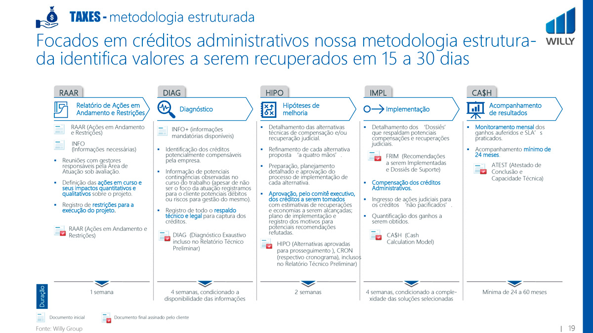 Esse produto também visa à recuperação administrativa de valores pagos indevidamente, porém em tributos como PIS, Cofins, CSLL, IRRJ, ICMS e IPI. A coleta de informações para esse trabalho pode demorar de uma a duas semanas, dependendo dos controles da empresa. Com os documentos em mãos, a Willy consegue identificar os créditos entre 15 e 45 dias e os valores já são abatidos/compensados no mês seguinte.